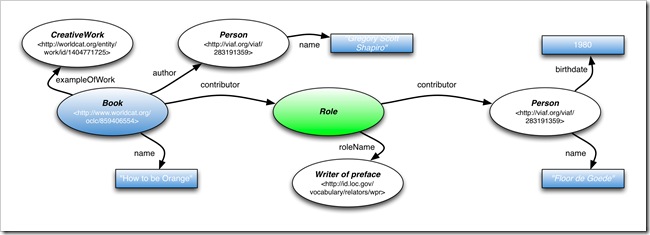 In the above example I relate a book to two people, the author and the writer of preface.  I could have linked to the author via another role with the roleName being ‘Author’ or <http://id.loc.gov/vocabulary/relators/aut>.  Although possible, it is not a recommended approach.  Wherever possible use the properties defined for a type.  This is what data consumers such as search engines are going to be initially looking for.